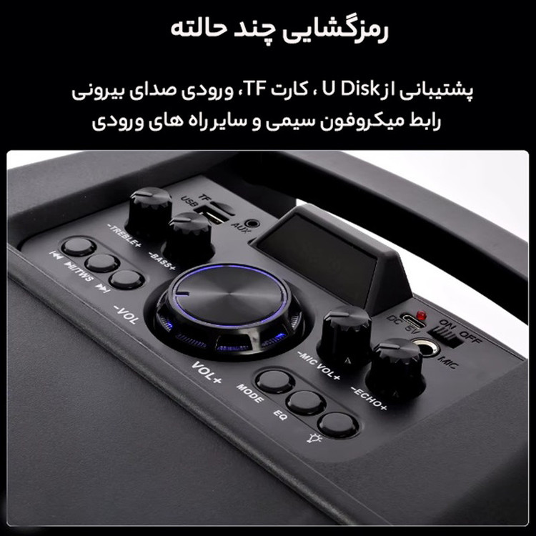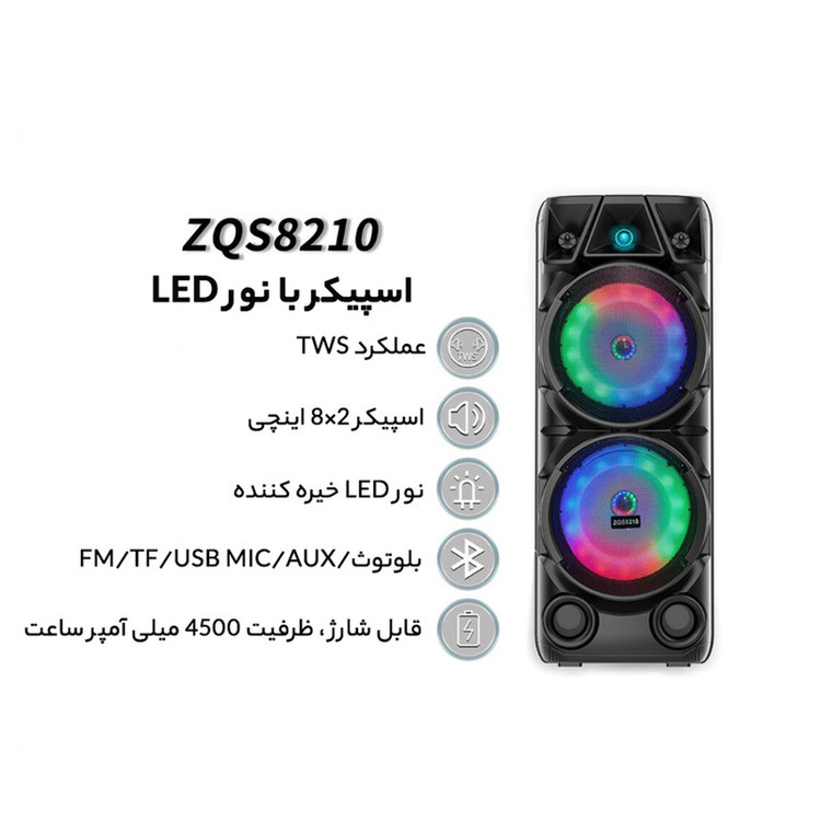 اسپیکر ZQS8210 یک اسپیکر بسیار زیبا از نظر طراحی بهمراه کیفیت ساخت بالا میباشد .این اسپیکر از نظر امکانات و کارایی کامل میباشد و هم فلش میخورد و بلوتوث و ایوایکس و میکروفون و ... در جلو اسپیکر یک پنل تمام ال ای دی قرار دارد که جلوه های محتلف نوری ایجاد میکند که در شب نمای بسیار زیبایی دارد . سایز باند های اسپیکر 8 اینچ میباشد که میتواند جوابگو جشن های 20-30 نفر را باشد . در بالای اسپیکر یک پنل حرفه ای برای تنظیمات صدا و نور اسپیکر قرار دارد