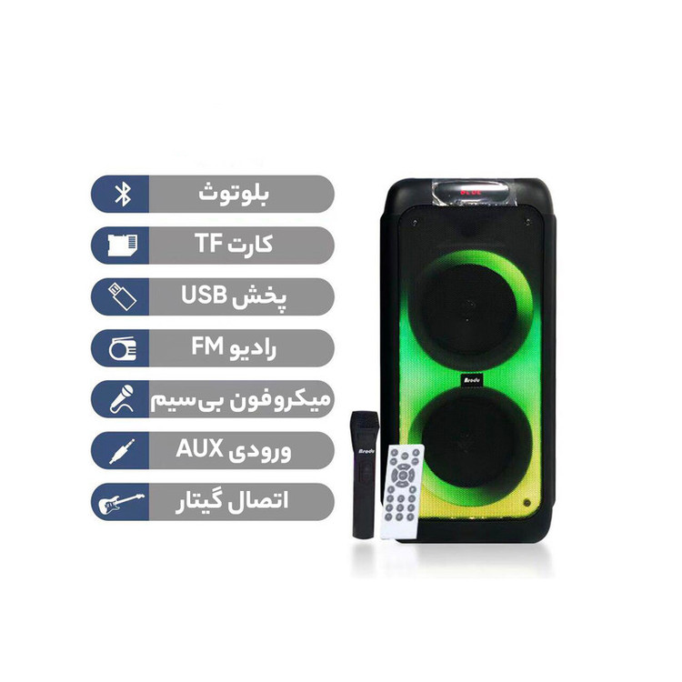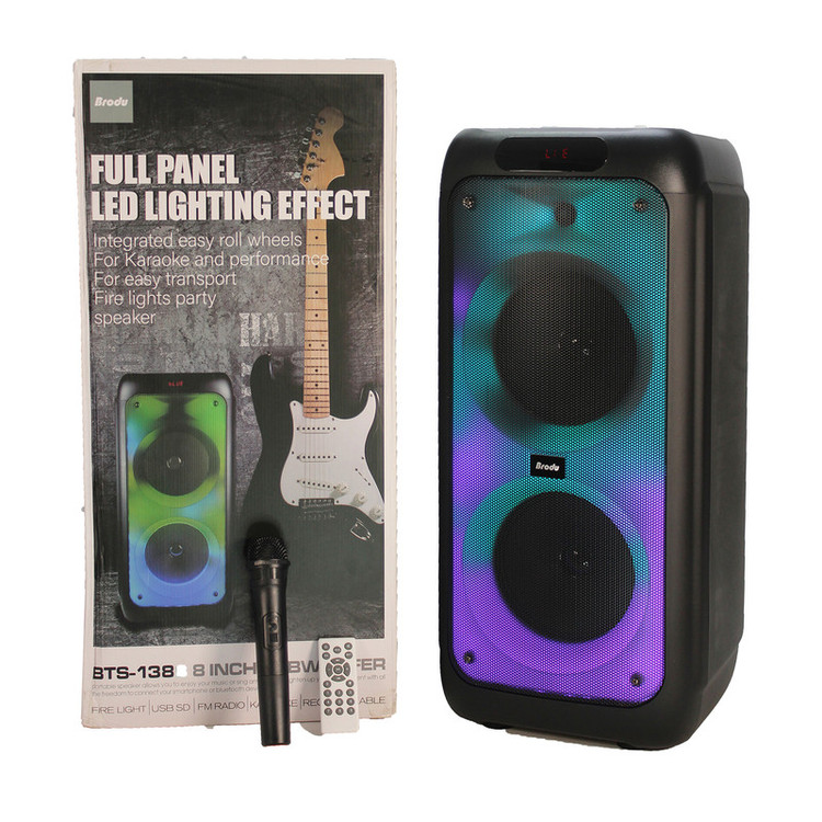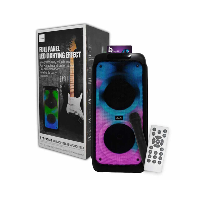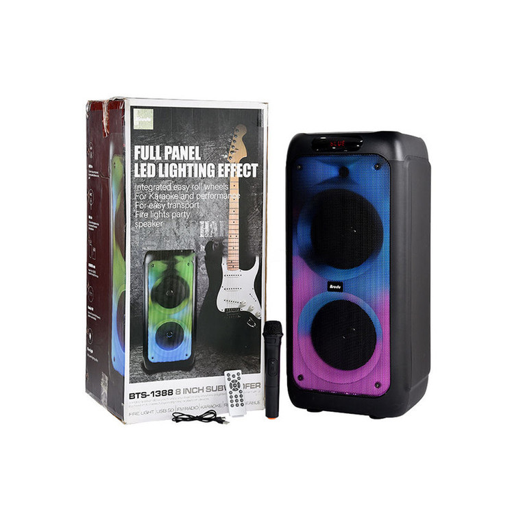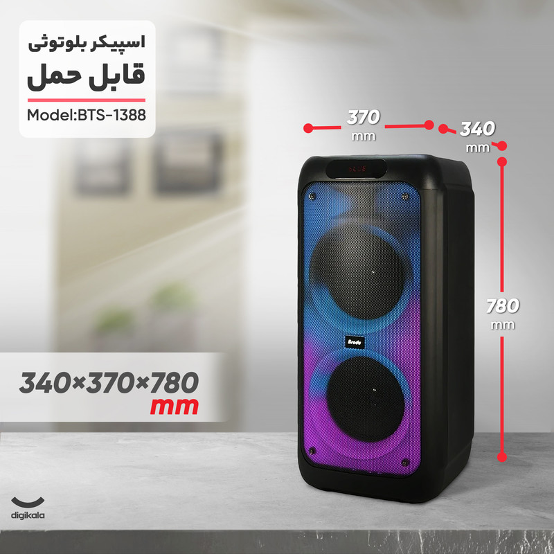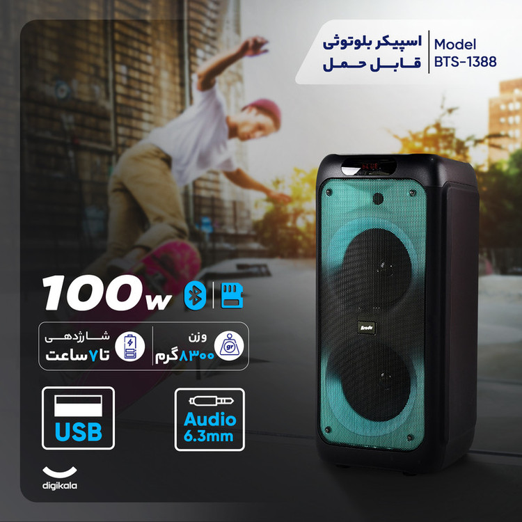 اسپیکر بی تی اس مدل 1388 از فناوری اتصال بلوتوث بهره برده است .این اسپیکر دارای بدنه فایبر محکم و ضد خش با کیفیت صدای بی نظیر است. همچنین دارای فول پنل ال ای دی با چندین حالت رقص نور بینظیر است. اسپیکر بلوتوث قابل حمل بی تی اس مدل BTS-1388 از یک میکروفون وایرلس با صدایی رسا بهره میبرد و دارای ریموت کنترل و کابل شارژر و دفترچه راهنما است. BTS-1388 از یک باتری 7.4 ولت لیتیومی با ظرفیت 4500 میلیآمپر ساعت برخوردار است که تامین انرژی میکند . همچنین از ساب ووفر 8x2 اینچی بهره میبرد و به دو صورت بیسیم و باسیم کاربرد دارد. این اسپیکر دارای 2 درگاه ورودی میکروفون و 1 درگاه ورودی گیتار/ صفحه نمایش دیجیتال/ ورودی AUX/USB/ TF /DC5V /رادیو FM است. همچنین دارای قابلیت ست شدن با دستگاه دیگر (TWS) و 2 عدد ولوم چرخان صدا و میکروفون و قابلیت ضبط کردن صدای خواننده را دارد. اسپیکر بی تی اس مدل 1388 با کیفیت عالی و عملکرد خوب جهت استفاده در دورهمیهای خانوادگی و جشن است.